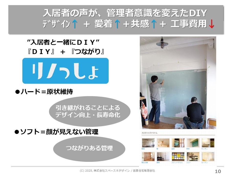 ここで面白かったのは、リノベーションの入居者さんが「自分でDIYで何かしたいな」と言ってくださることが2008年ぐらいから出だしたことです。ここで感じたのは、入居者さんがDIYに取り組むと、つながりを持てるようになったことです。