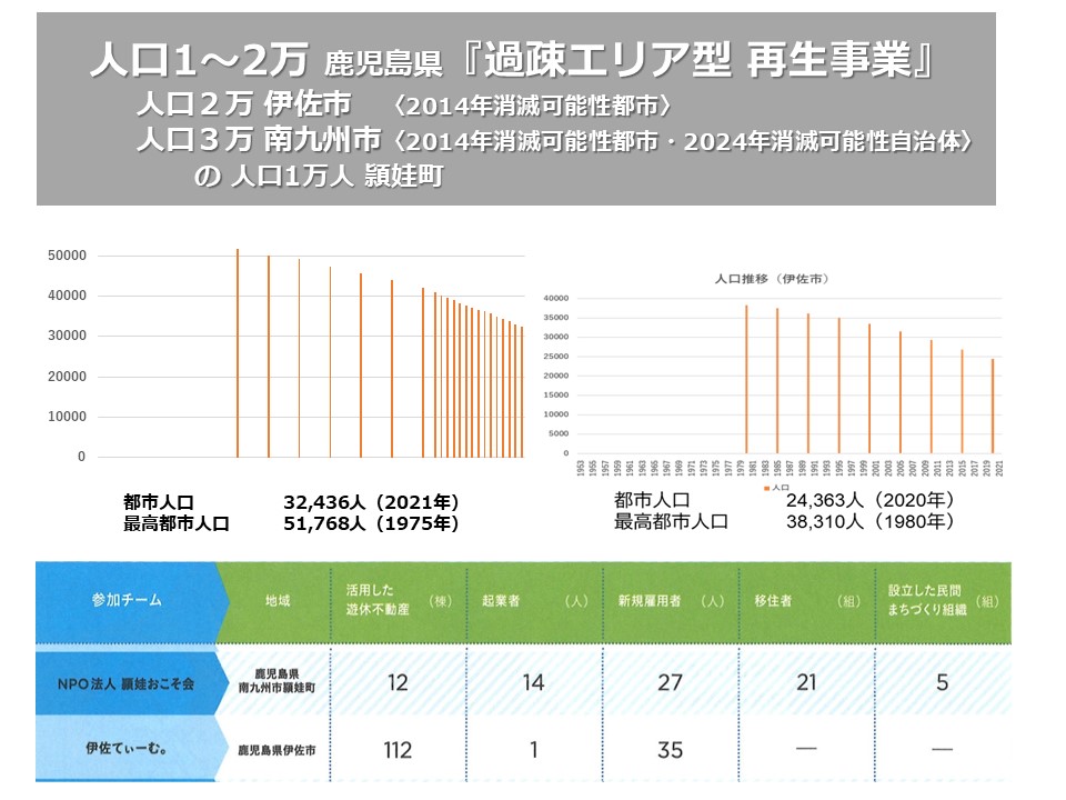 もっと人口が少ない人口1、2万のまちです。鹿児島県の伊佐市と南九州市のお話をさせていただきます。どちらも消滅可能性都市です。それも、どんどん人が減っています。過疎とも言えるのでしょうか。