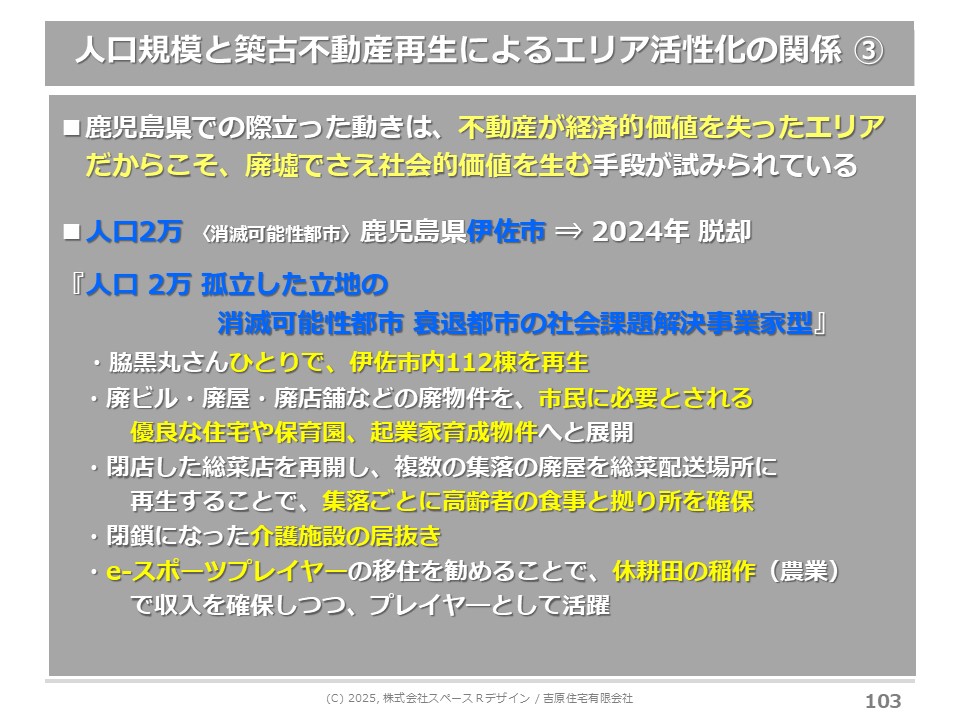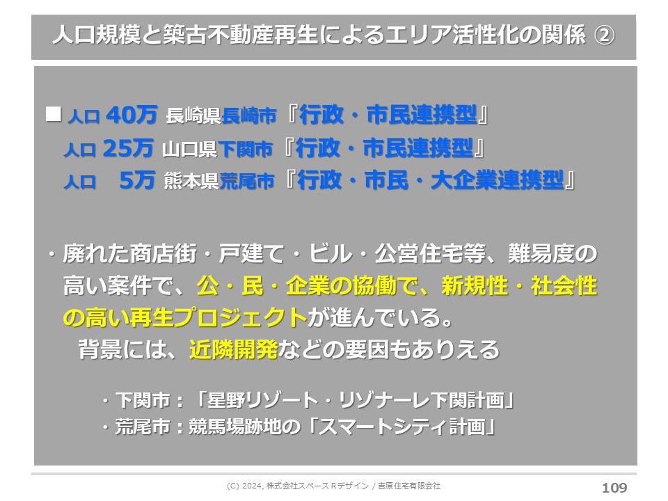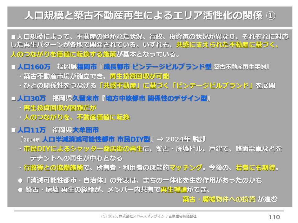 共感というベタな言葉しかまだ見付けられていないのですが、日本人が元々持っていた住まいの感覚、まちへの感覚を、衰退社会の中でもう一度見直してみると、実は築古物件がすごいポテンシャルを持っている時代に入っています。ただ、都市の人口規模によって全く違う世界観がありました。
