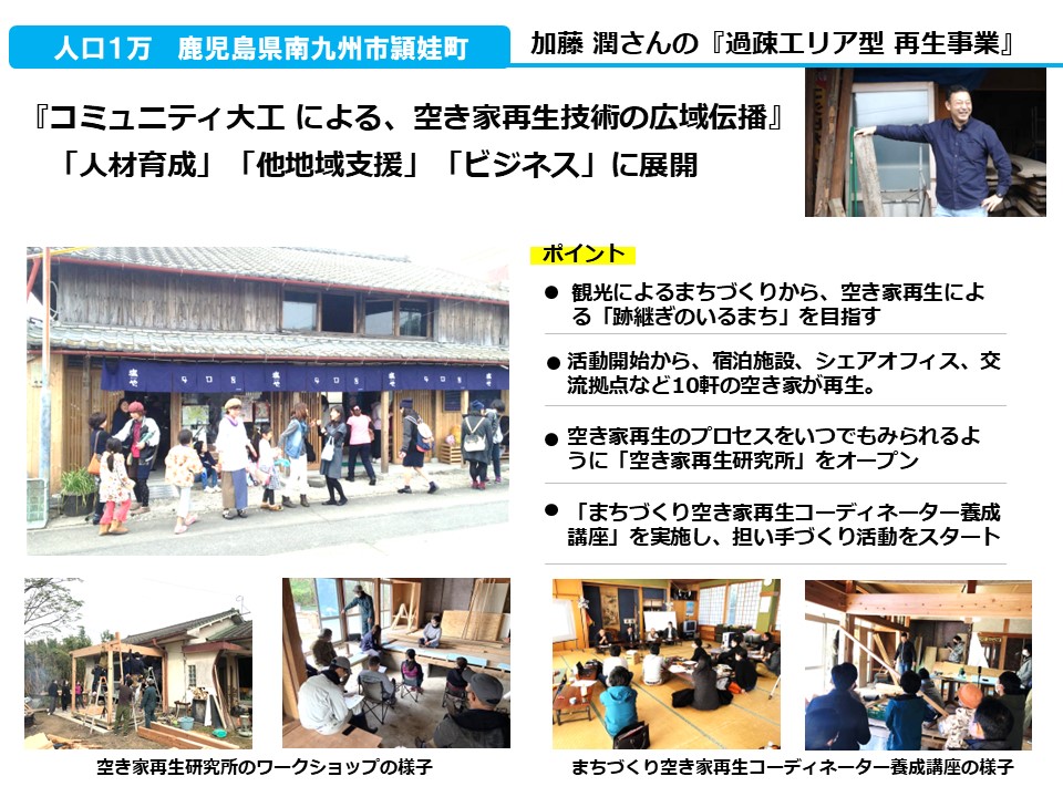 今、加藤潤さんが、集落が滅びそうになっているところに拠点を作り、「コミュニティ大工」の弟子を作ることによって、それぞれの集落の拠点が再び復活しています。現在、42の場所でこんなことが起こっています。