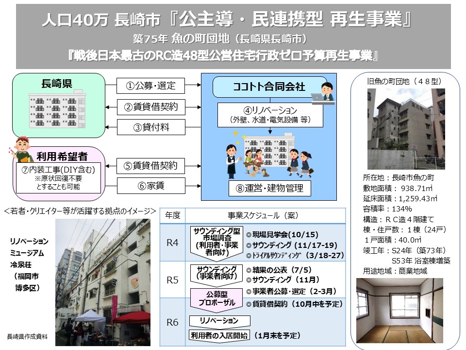 長崎に「魚の町団地」という、長崎県営の日本最古のRC公営住宅、48型の団地があります。この再生を県庁の職員さんたちが中心になって動かしていったという事例です。今すごくいい形で動き始めていますので、ここもぜひ視察に来ていただけたらと思います。