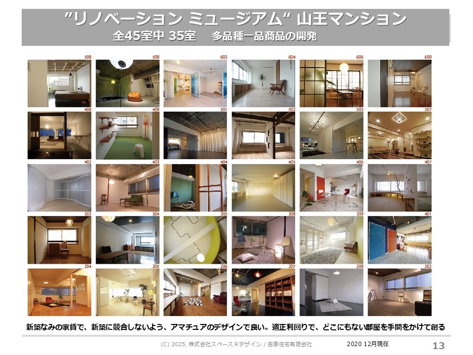 「山王マンション」は今、1棟の中にこれだけ違う部屋がある賃貸のリノベーションミュージアムです。当初から、周りの新築家賃並みの設定をしても、入居者さんに入っていただけるようになりました。