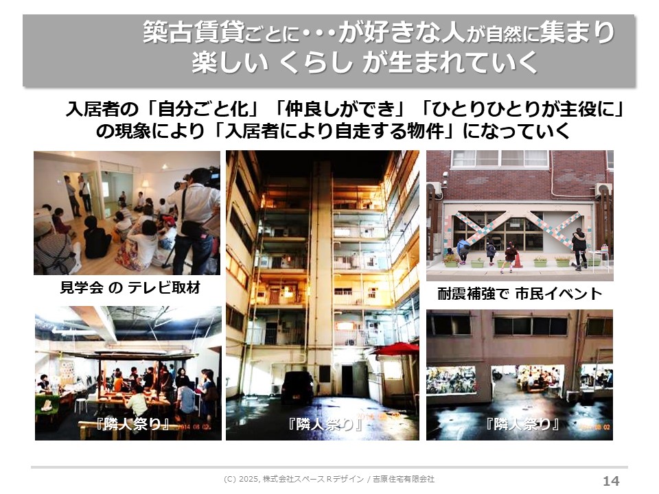 すごく驚いたのが、リノベーション賃貸は入居者さんが勝手に仲良くなって、パーティーをやり始めたことです。賃貸ごとにテーマは違いますが、何かが好きな人が集まる賃貸は、楽しい暮らしが生まれていくものなんだな。それは、入居者さんが自分の部屋を自分ごと化するうちに、建物自体を自分ごと化し、仲良しができ、一人ひとりが主役になる、入居者さんが自走していく物件が築古賃貸なんだというのが分かりました。