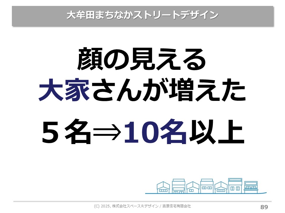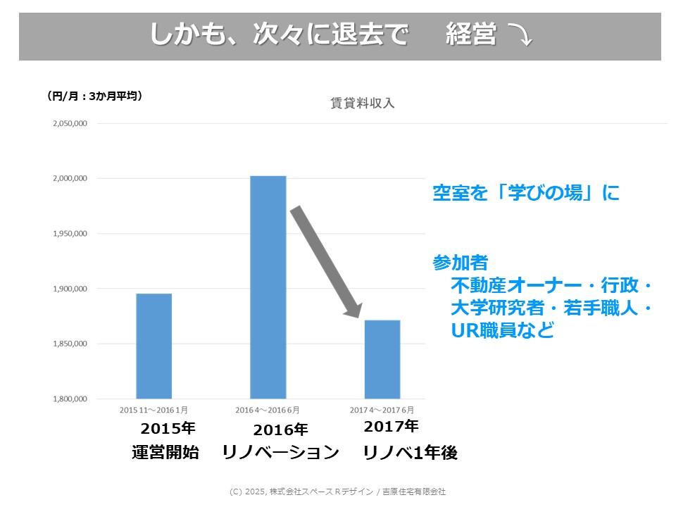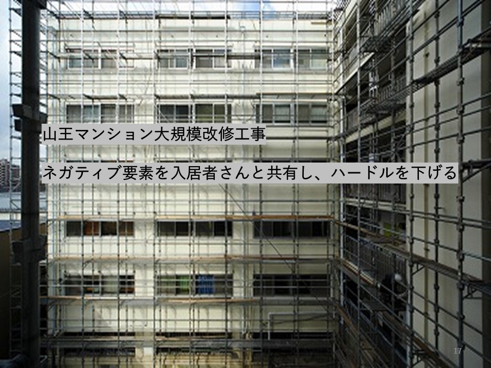 民間賃貸って、コンサル案件もみんなそうなんですけれども、まず一部屋でやってみましょうよと。そしたら、すごくすてきな入居者さんが結構な家賃で入ってくれた。じゃあ、2部屋目、3部屋目、それが何部屋もできてくると、上積みキャッシュがかなり増えるのを経営上実感されていますので、それで皆さん大規模改修に入られる。100年までいかないですけど、70年ぐらいは持たせる感覚で、家庭教師みたいなコンサルをやっています。