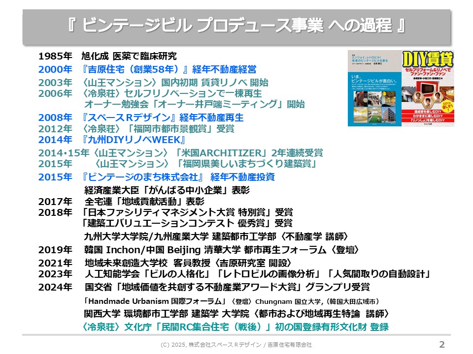 今日は、吉原勝己さまにおいでいただきお話しいただきます。吉原さんは、製薬会社にお勤めでしたが、経営難に陥った築古マンションを一族から引き継いで、リノベーションやDIYを開拓しながら、次々とビルを再生された方です。