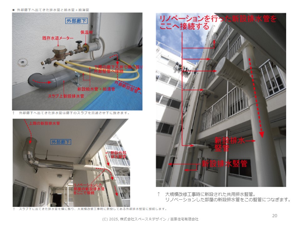 それともう一つは配管の漏れです。集合排水管の漏れなんですが、部屋間に埋め込まれていて手が届かない、改修できない状態でボテ漏れが起こっていました。そこで配管を新たに外付けして、室内のリノベーションするたびにここに接合していく。写真のように部屋から外に抜いて新設の竪管に接合することでクリアしていくという手法で、配管漏れがなくなりました。