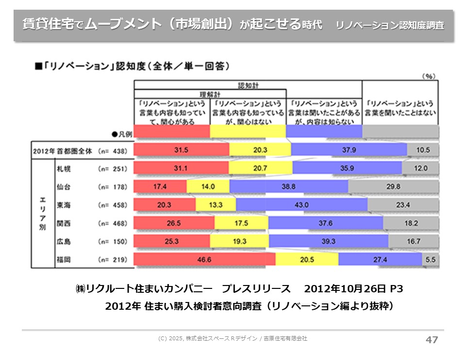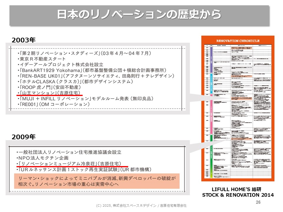 賃貸住宅分野ではリノベーションという言葉がまだない頃でした。先生が誰もいない状態で、先行しているグループもほとんどいませんでした。大阪のアートアンドクラフトさんが動かれだしたぐらいの時期で、東京R不動産もまだなかった頃でしたので、先行モデルがないなかで個人的にリノベーションの商品開発を進めたということです。