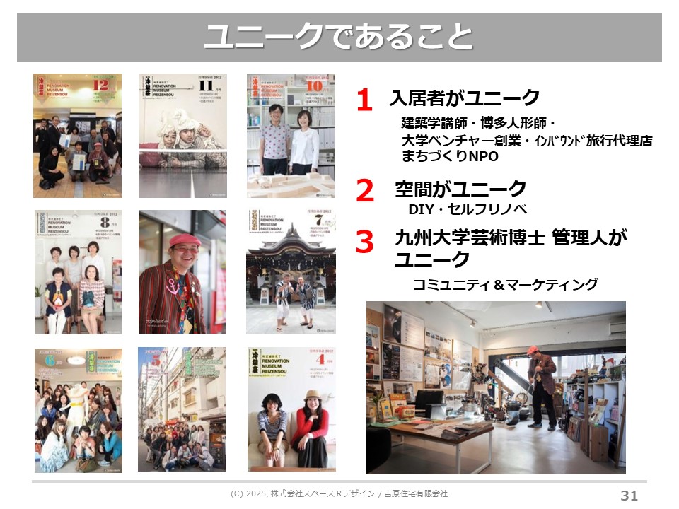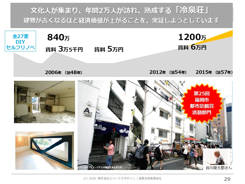 父親から引き継いだ経営難に陥っていた築古の賃貸マンション・オフィスビルで2003年からリノベーションを実施。最初に取り組んだ山王マンションでは空室がでるごとにユニークなテーマを設定し、いまでは唯一無二の部屋があるビンテージマンションに。冷泉荘ではリノベーションミュージアムをコンセプトに打ち出しDIYセルフリノベーションに取り組む入居者を募集。ひと、まち、文化を大切に思う人たちが集まる文化発信拠点になっています。また冷泉荘は2024年に戦後の民間集合住宅として国内初の国の登録有形文化財となっています。