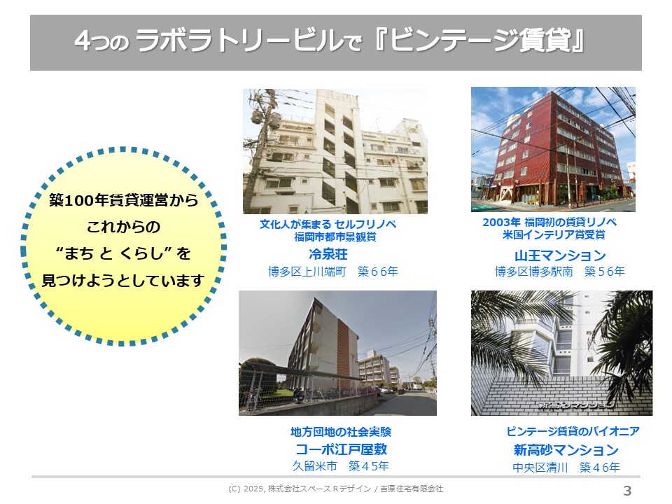 コーポ江戸屋敷では空いた部屋がなかなか決まらないという問題が今、出てきました。そこで、お金をかけてリノベーションを再度やろうというプロジェクトを始めました。能力のある若手の設計者を3人立てて、3人一緒にリノベーションを始めていく。そこに職人さんも絡んで、フェーズ2では職人さんたちがその部屋で発信しながら部屋を作っていく。フェーズ3では、アーティストとか発信者の人たちが最初からそこに関わって、そのプロジェクトを久留米中に出していく立体的なプロジェクトを、ちょうどスタートさせたところです。もしかしたら、家賃限界を超えることができるかもしれないという実験です。ちょうど僕のFacebookにあげたところです。