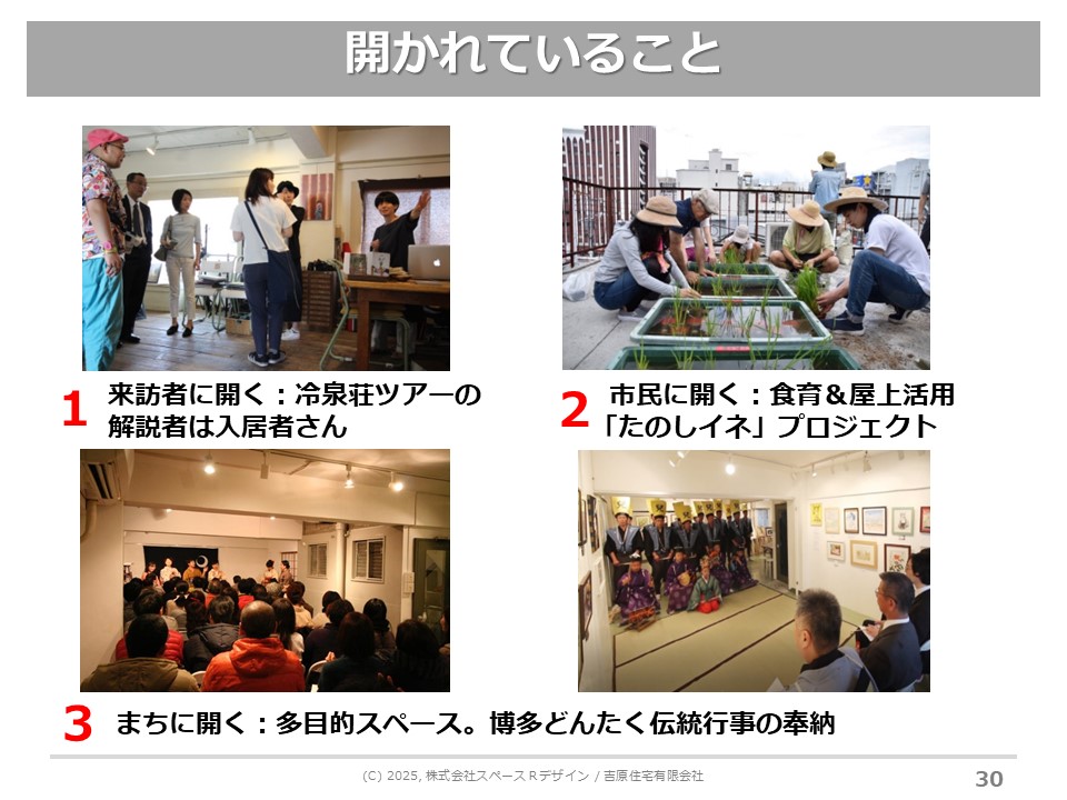人口規模というか都市の規模によって、空き家の形態もビルだったり民家だったりと大きく違っています。しかし、共感で人が集まるという仕組みは基本です。建物ごとにその共感に集まる仕組みを、各地の皆さんがいろんなスタイルで実行されています。