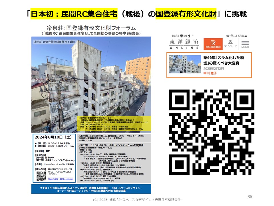 そして「冷泉荘」が日本で初めての民間RC賃貸の登録文化財となったというきっかけから、文化庁の要請により、今後、民間賃貸のRC物件を文化財にしていくために建築文化フェローという役割を担うことになりました。