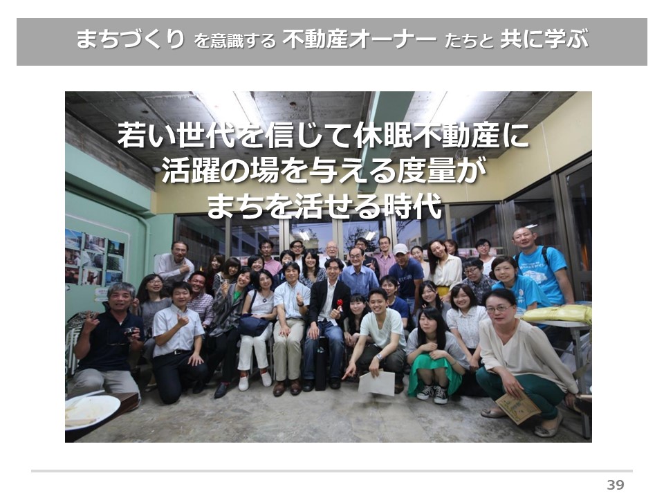 「君たちは空き家のある不動産再生の機会に恵まれためったにない世代なんだよ、頑張れ」と言ったら、身の回りの「あの物件を動かすとおもしろそう」と言い出します。若い人たちが主役になれる場面が、ここで作れるんじゃないか、という夢を感じております。
