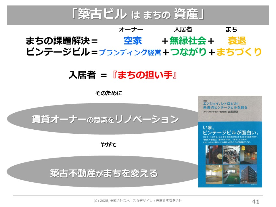 廃虚ビルはそれなりの数があり、まちのど真ん中にある廃虚物件が、こんなすてきな建物、活躍している人たちが集まる建物に変わったという衝撃はすごい。すると私のまちでもできるかもしれない、という思いを呼び起こす。廃虚を再生する技術が、今はまちの活性化を加速させる技術になっています。何とか廃墟ビル再生のテキストを作りたいなと思っております。