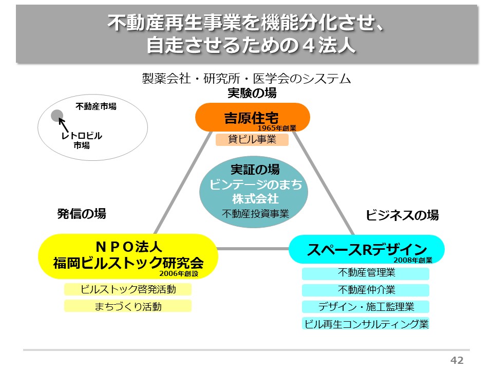 私は、ご紹介のように製薬会社で薬の開発をしておりました。そこでは、新規物質を薬にしておりました。そこに不動産の再生を結び付けていくと、今後新しい分野がたくさん生まれていきそうで、皆さまからもご意見いただければと思います。