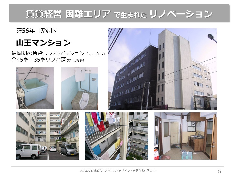 親から継いだ物件が「冷泉荘」「山王マンション」「新高砂マンション」の3棟です。当時はそうでもなかったんですが、福岡の発展につれて今や福岡の中心部にある物件になります。この3棟の事例のご紹介をさせていただきます。