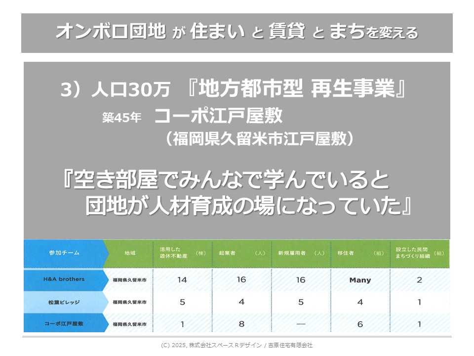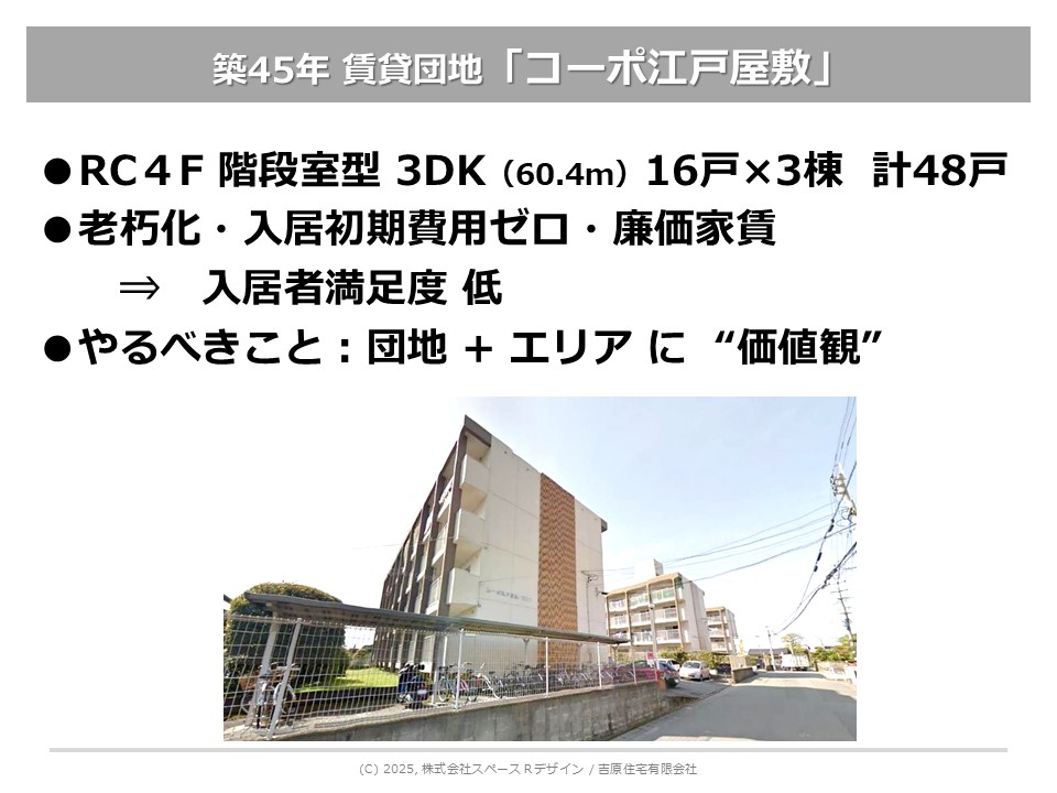 また地方の団地は経営が大変だということで、オーナー仲間から久留米の団地を譲って頂き、団地を再生する実験的な取り組みをやっているのが「コーポ江戸屋敷」です。こちらも一部お話しさせていただきます。